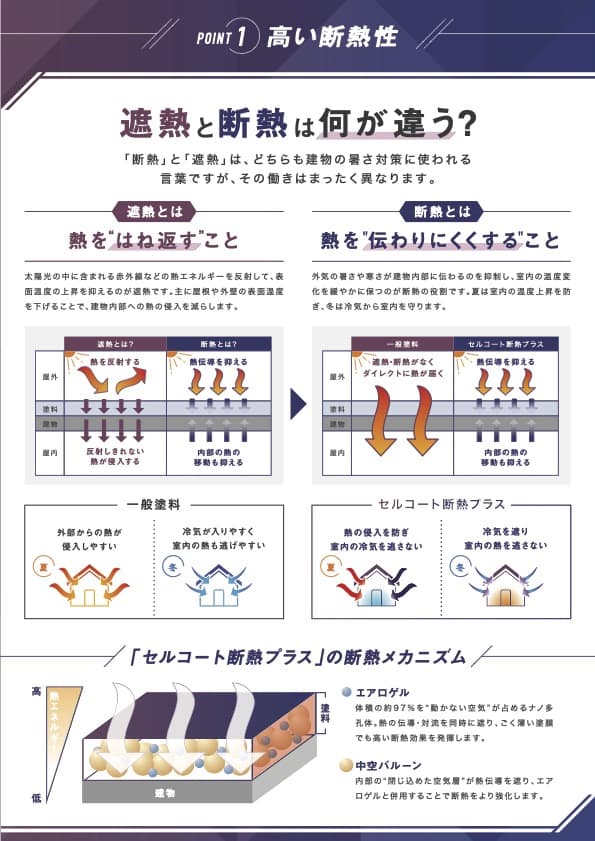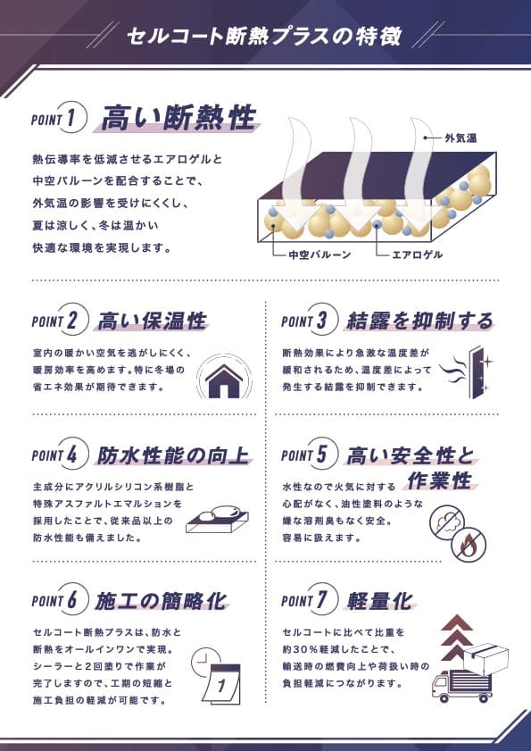 セルコート断熱プラスは、アクリルシリコン系樹脂と特殊アスファルトエマルションにエアロゲルと
