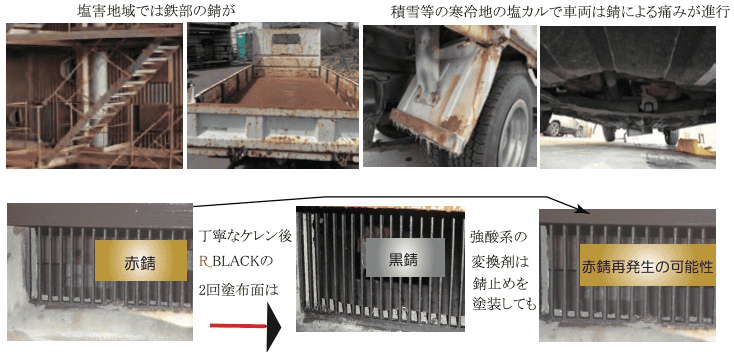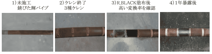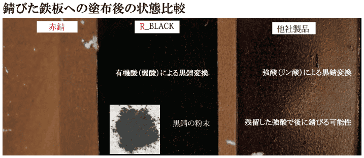 * R_BLACKを塗布する事で強酸(リン酸等)の黒錆変換剤利用の残留強酸による再度の錆発生がなく、